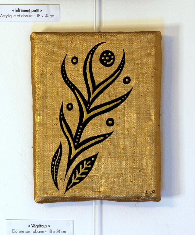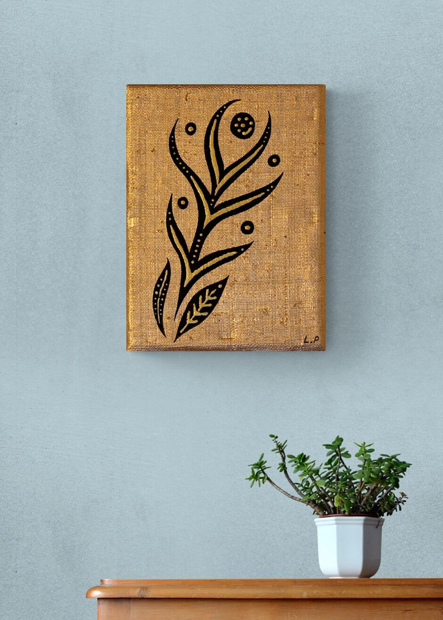 Collage de rabane sur toile, dorure, Posca et peinture 3D - 24 x 18 cm
